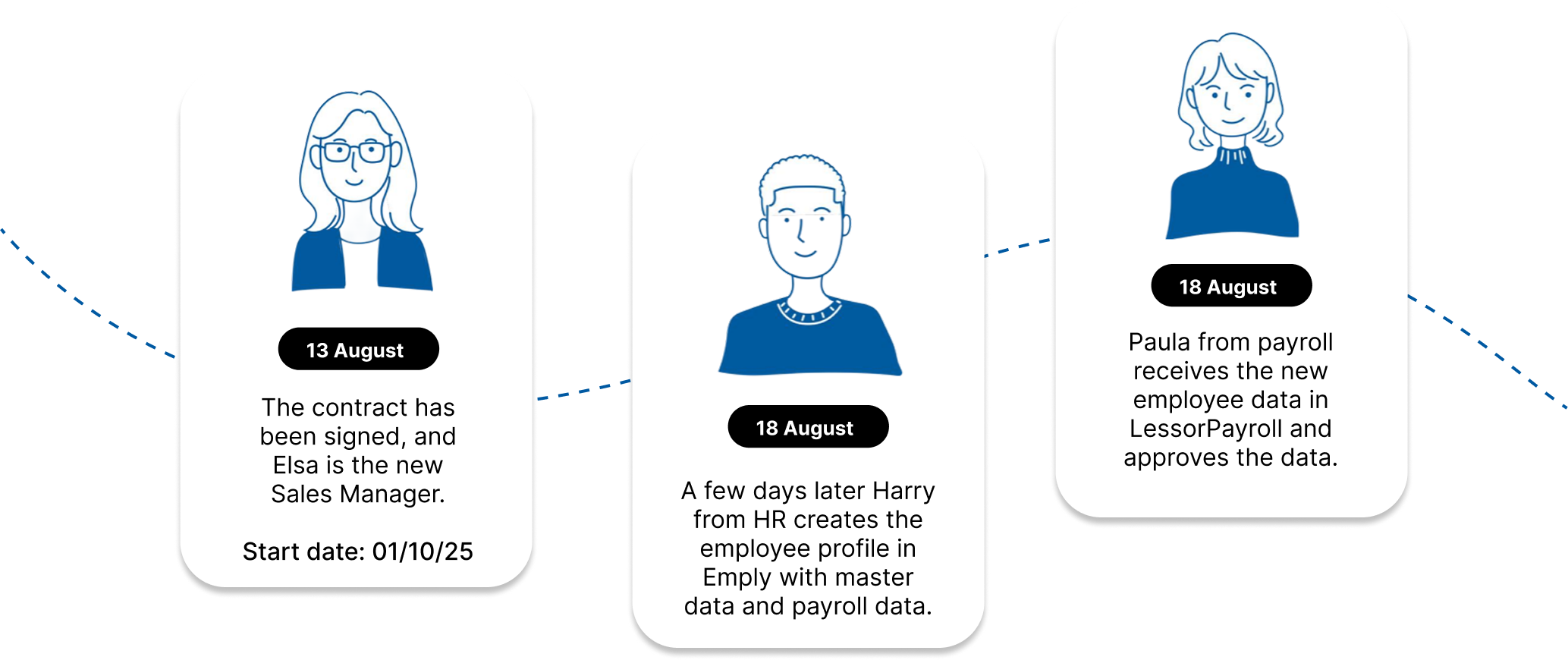 Once the contract is signed, Harry from HR creates her profile in Emply with all necessary employee data. Thanks to the Paychex Europe Integration Platform, Elsa’s information is automatically transferred to LessorPayroll — no duplicate entry needed.